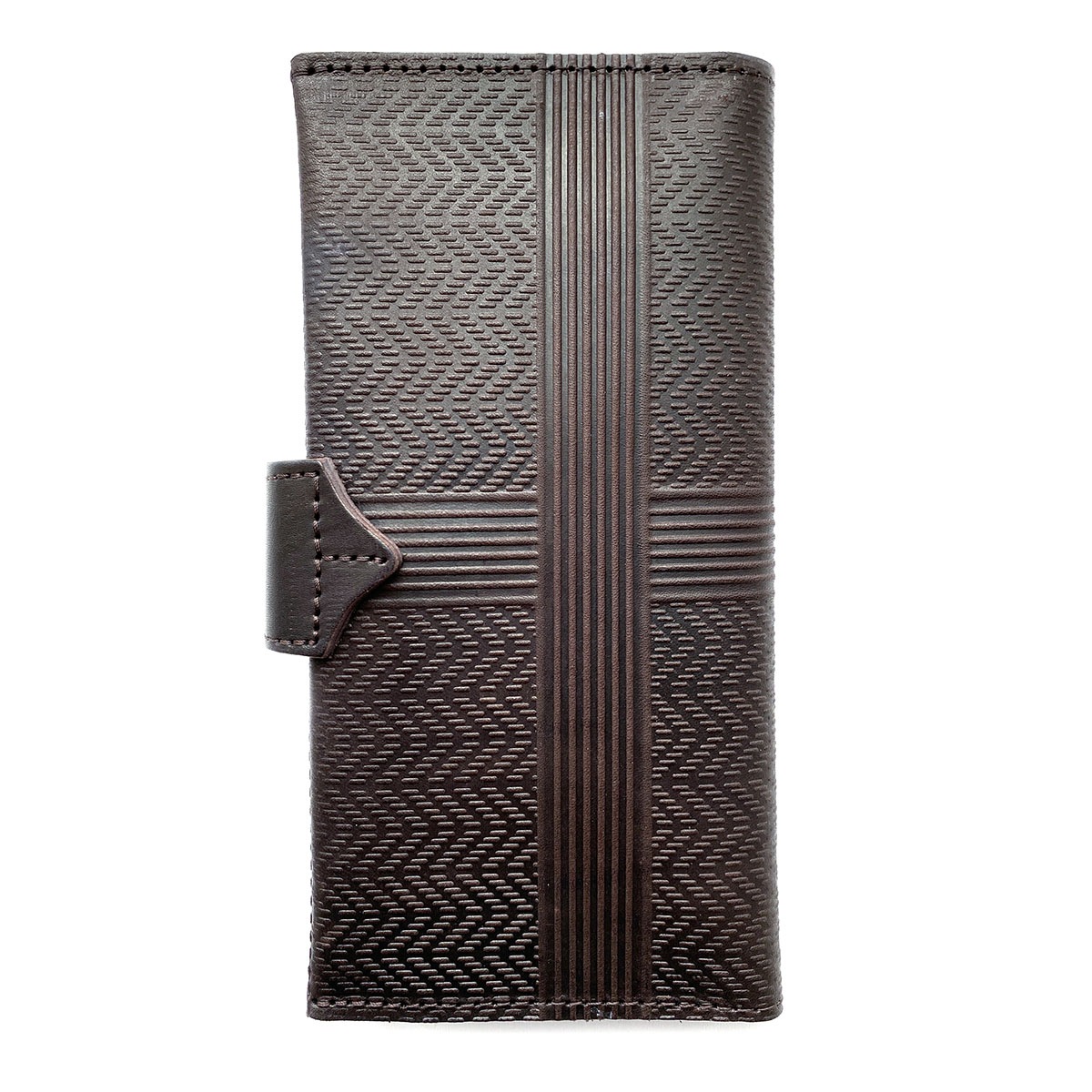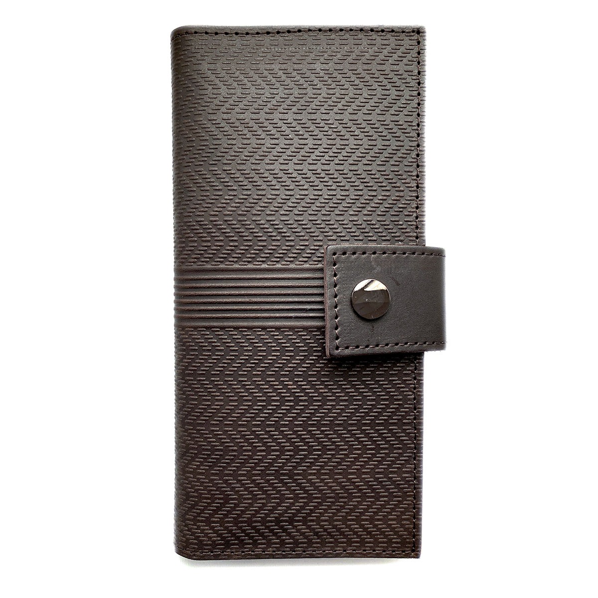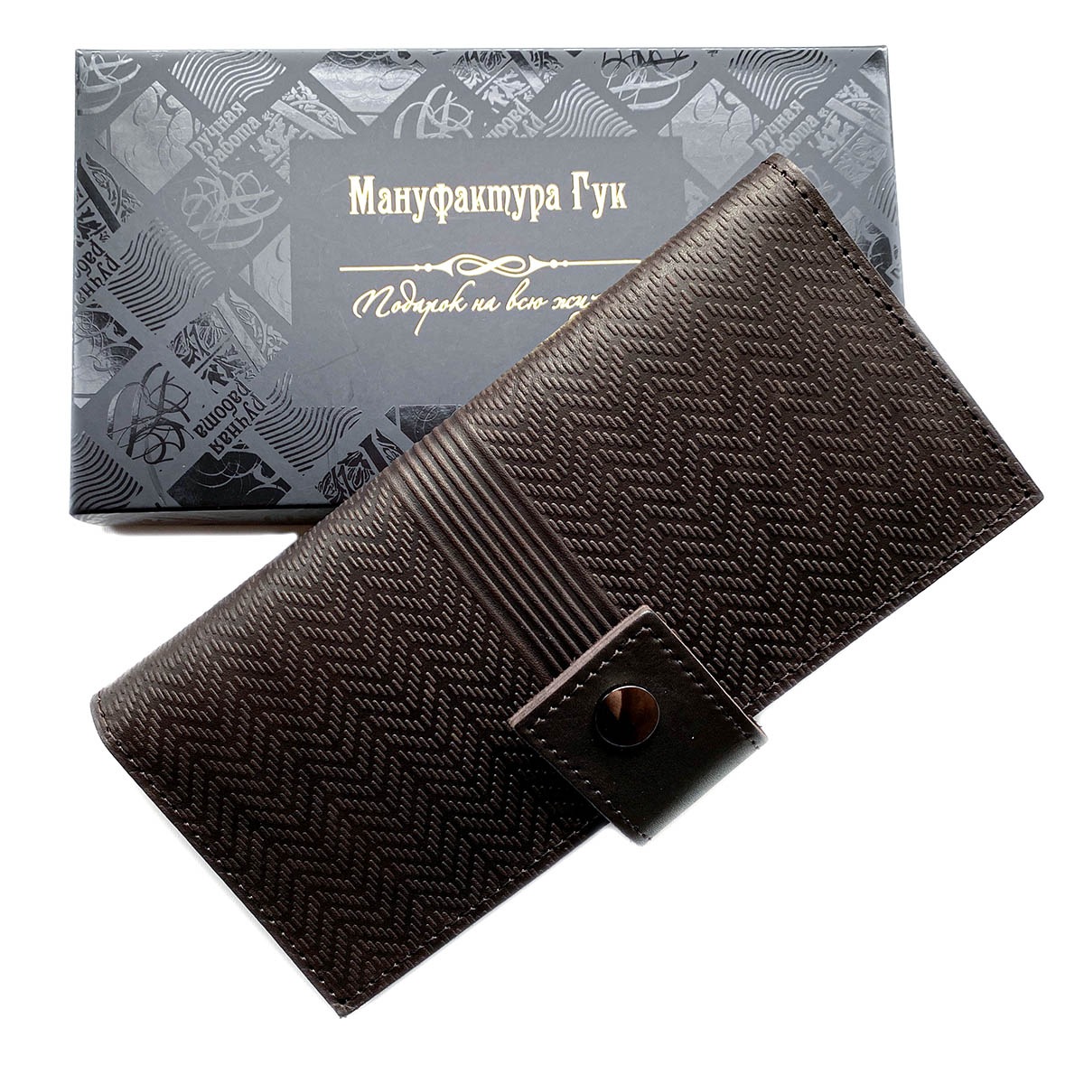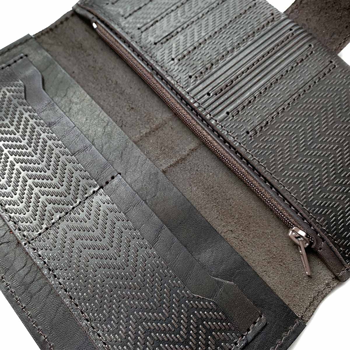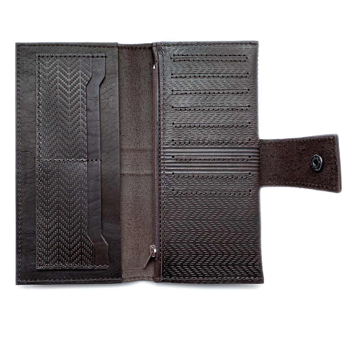 Портмоне большое из натуральной кожи с тиснением. Внутри слева: 4 кармана для карт + 1 карман на всю длину. Справа: 9 карманов для карт, два кармана на всю длину портмоне и также один карман на молнии, в котором удобно хранить монеты. Закрывается на кнопку. Портмоне сделано без картонного каркаса, для изготовления использовалась кожа 1,1..1,3 мм. Портмоне держит форму за счет плотности кожи.