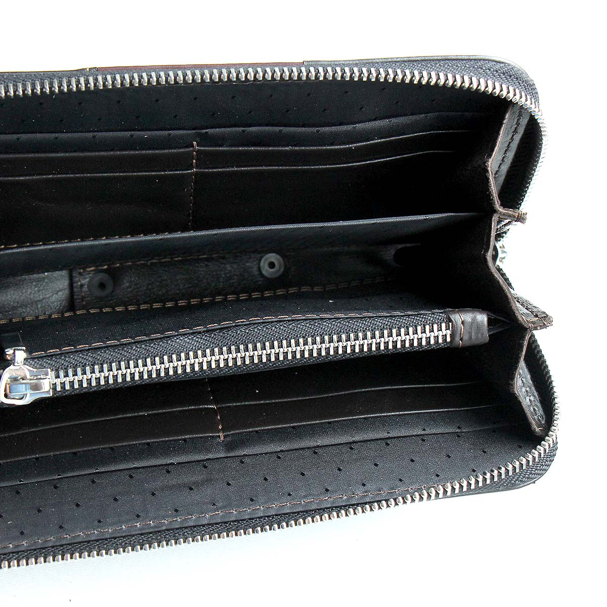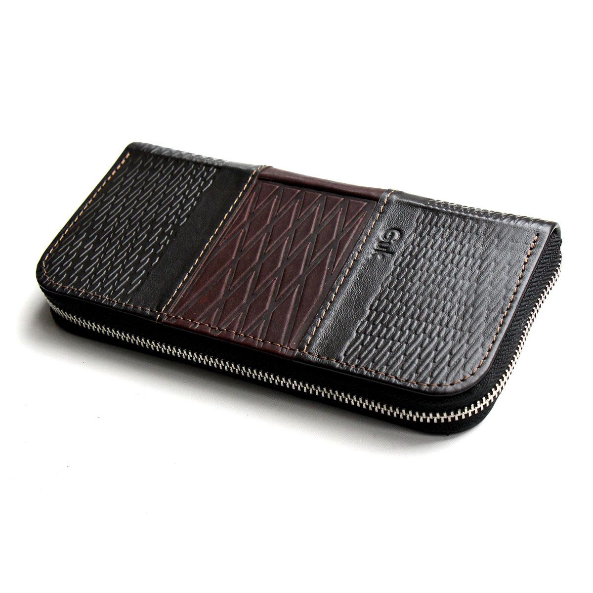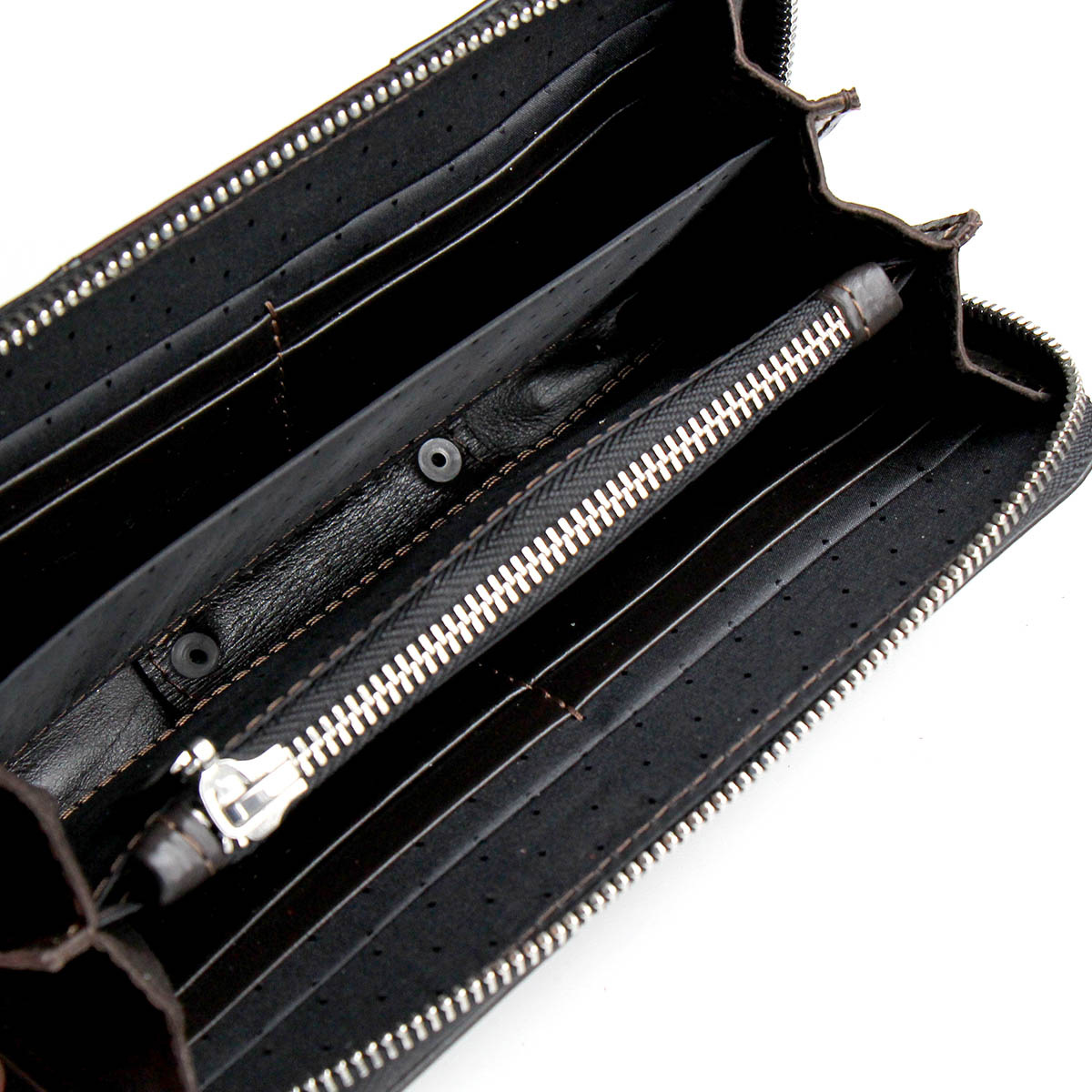 Портмоне большое на молнии "DOMUS" из натуральной кожи с тиснением. В портмоне 4 больших отделения для купюр, одно из этих больших отделений закрывается на молнию. Также имеется 8 карманов для карточек, и два вспомогательных отделения для купюр размером 20х7 см.
