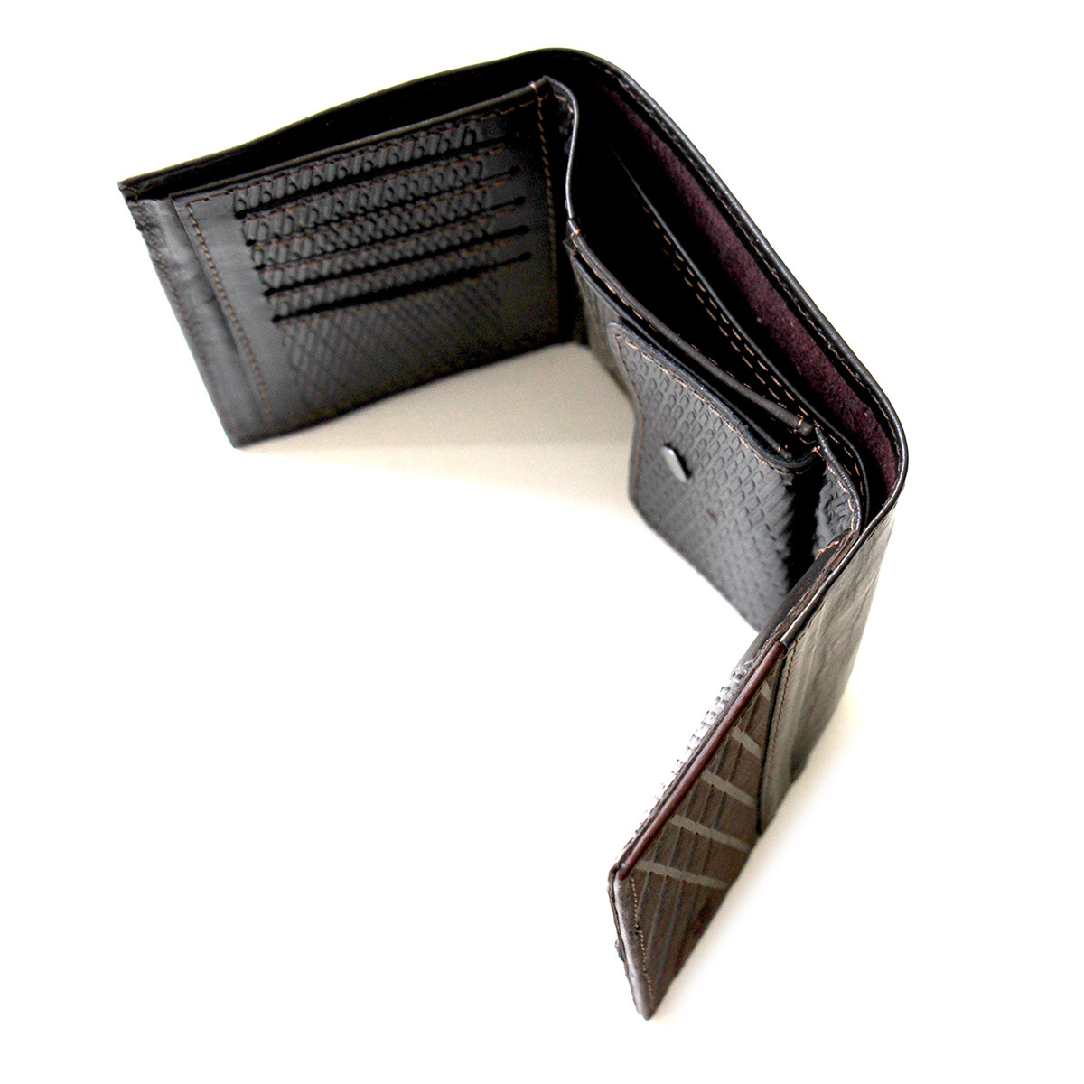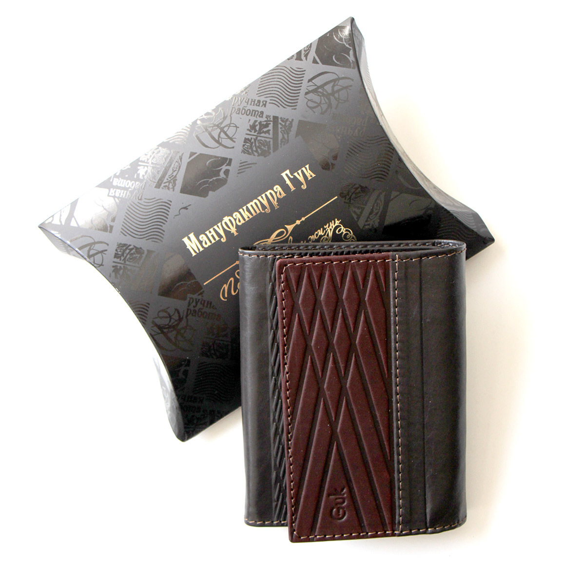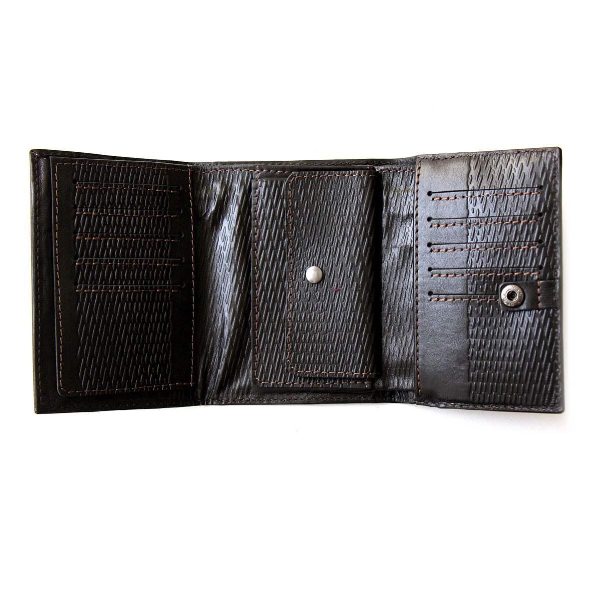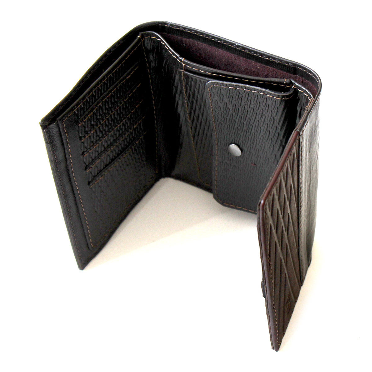 Портмоне большое "DOMUS" из натуральной кожи с тиснением. Имеется 10 отдельных карманов для карточек, 2 вместительных боковых кармана для документов, 2 вертикальных отделения для бумажных купюр, а также каман на кнопке для хранения монет. Закрывается на кнопку.