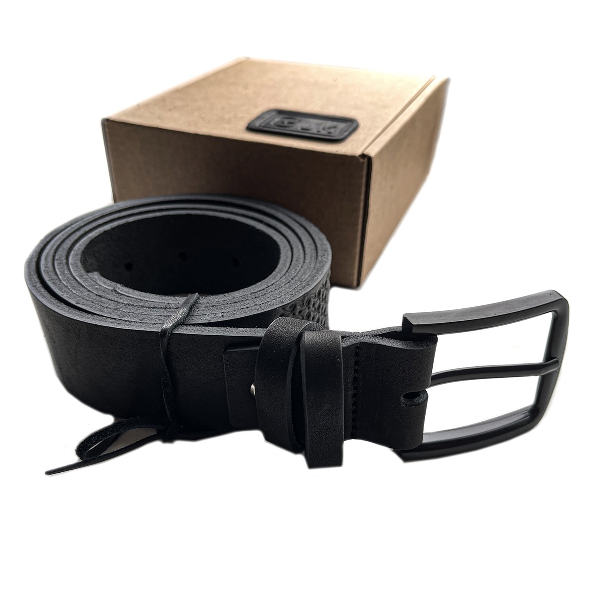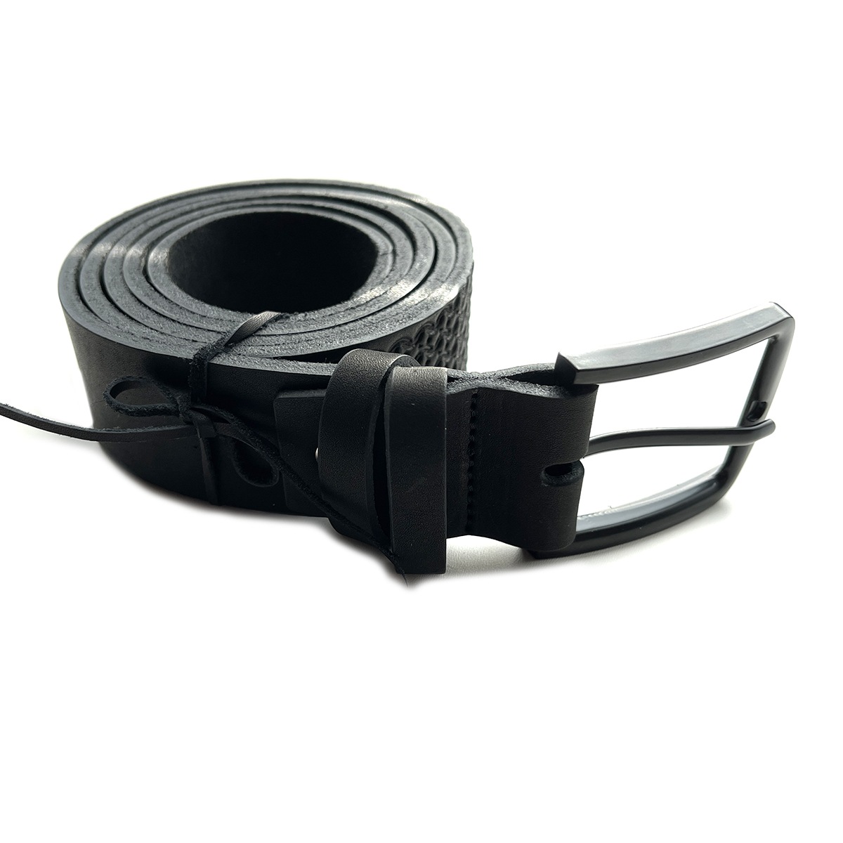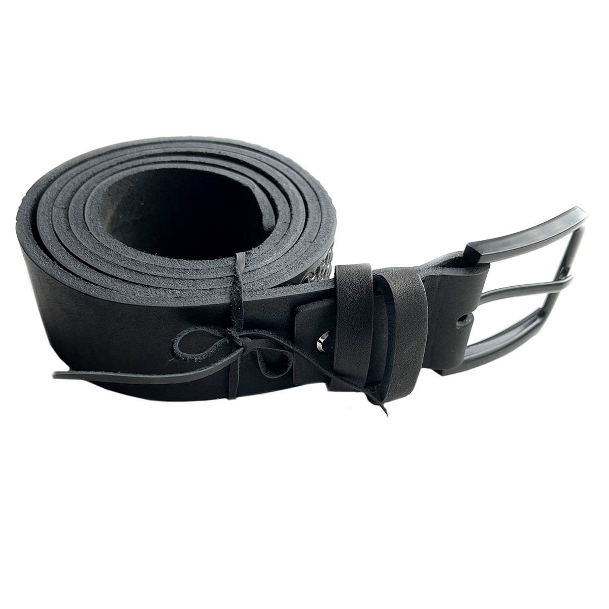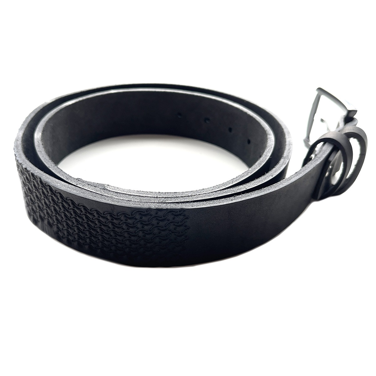 Ремень из натуральной кожи для брюк и джинсов ручной работы. Ремень и пряжка черного цвета, ширина ремня 4 см. Ремень декорирован тиснением. Для изготовления используется натуральная кожа толщиной 3,5-4 миллиметра, в один слой. Длина ремня 130 см, с возможностью изменения размера в меньшую сторону. Для этого нужно открутить болт рядом с пряжкой, отрезать лишнюю часть ремня со стороны пряжки, просверлить или пробить отверстие под болт.