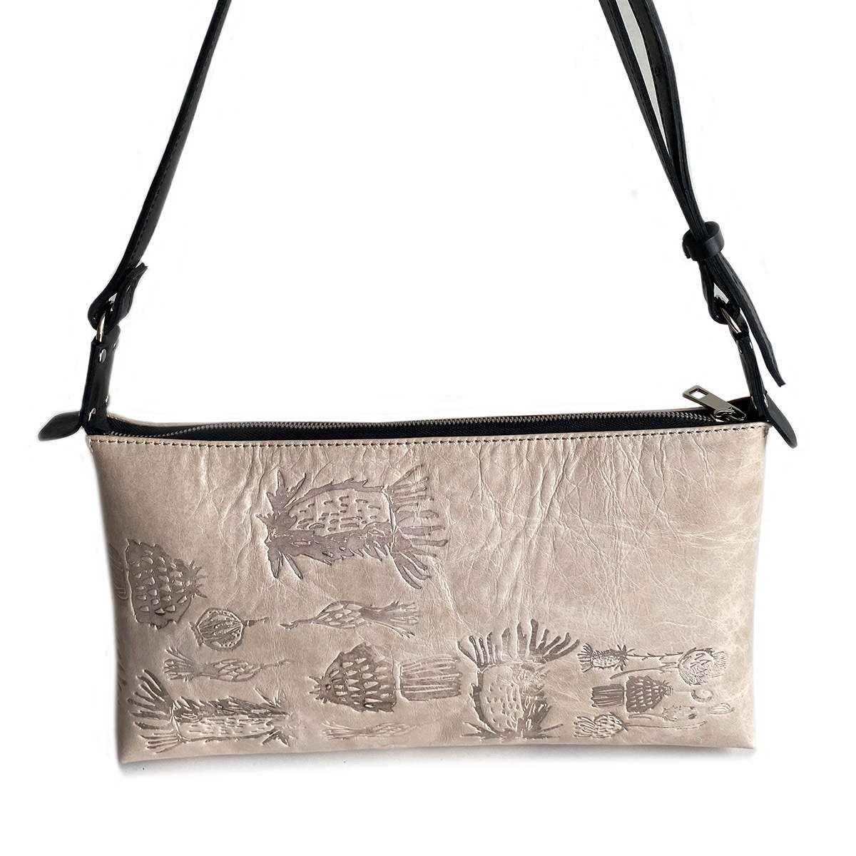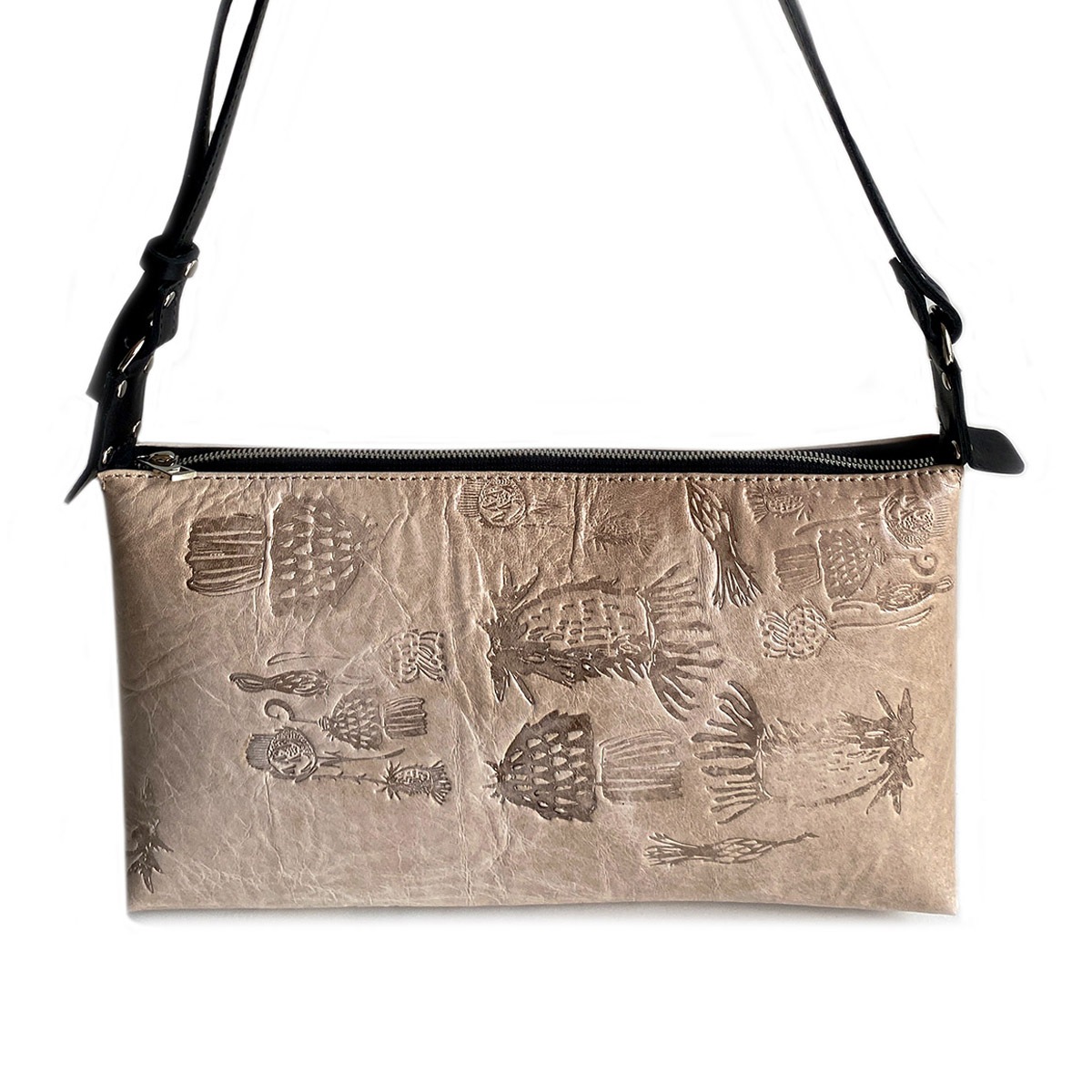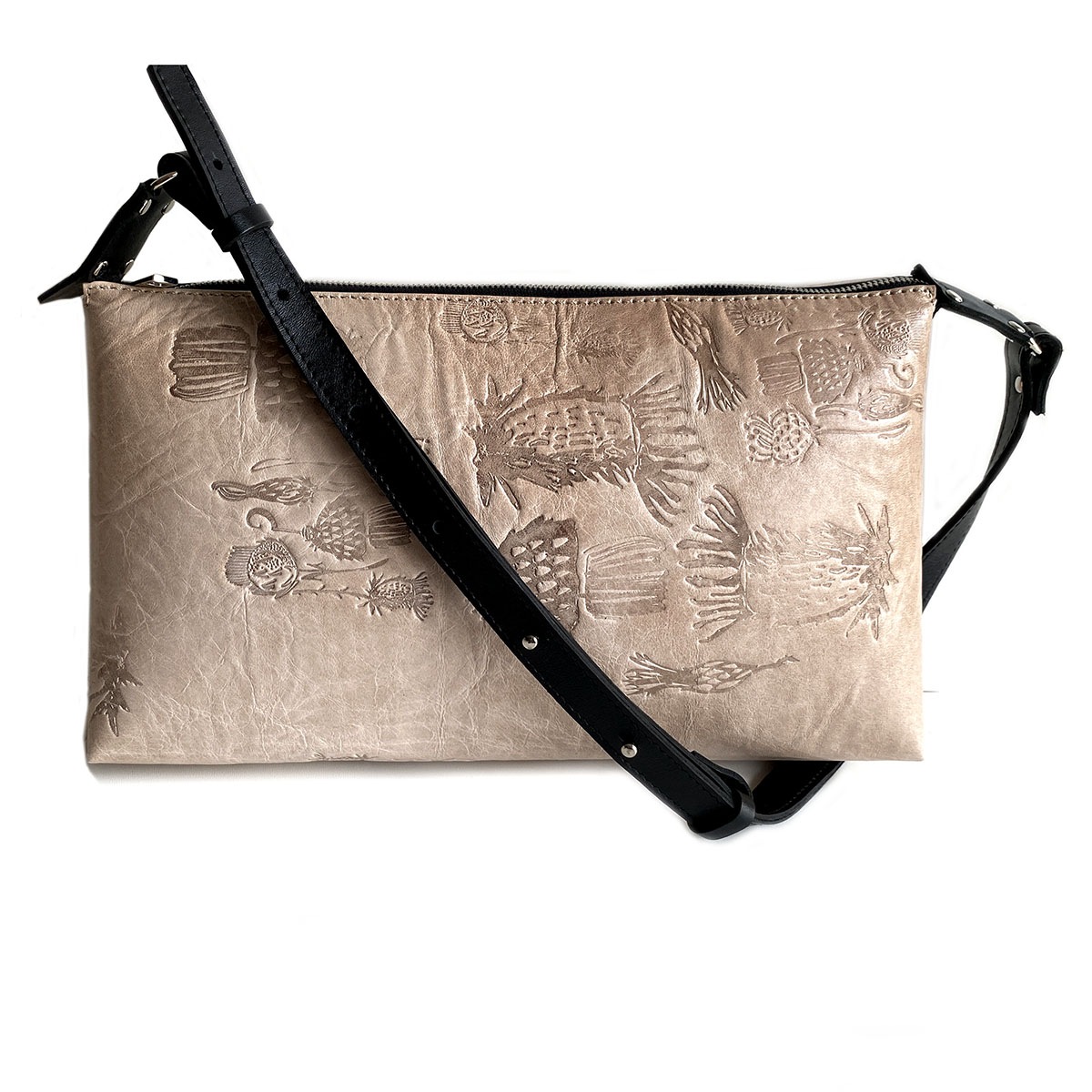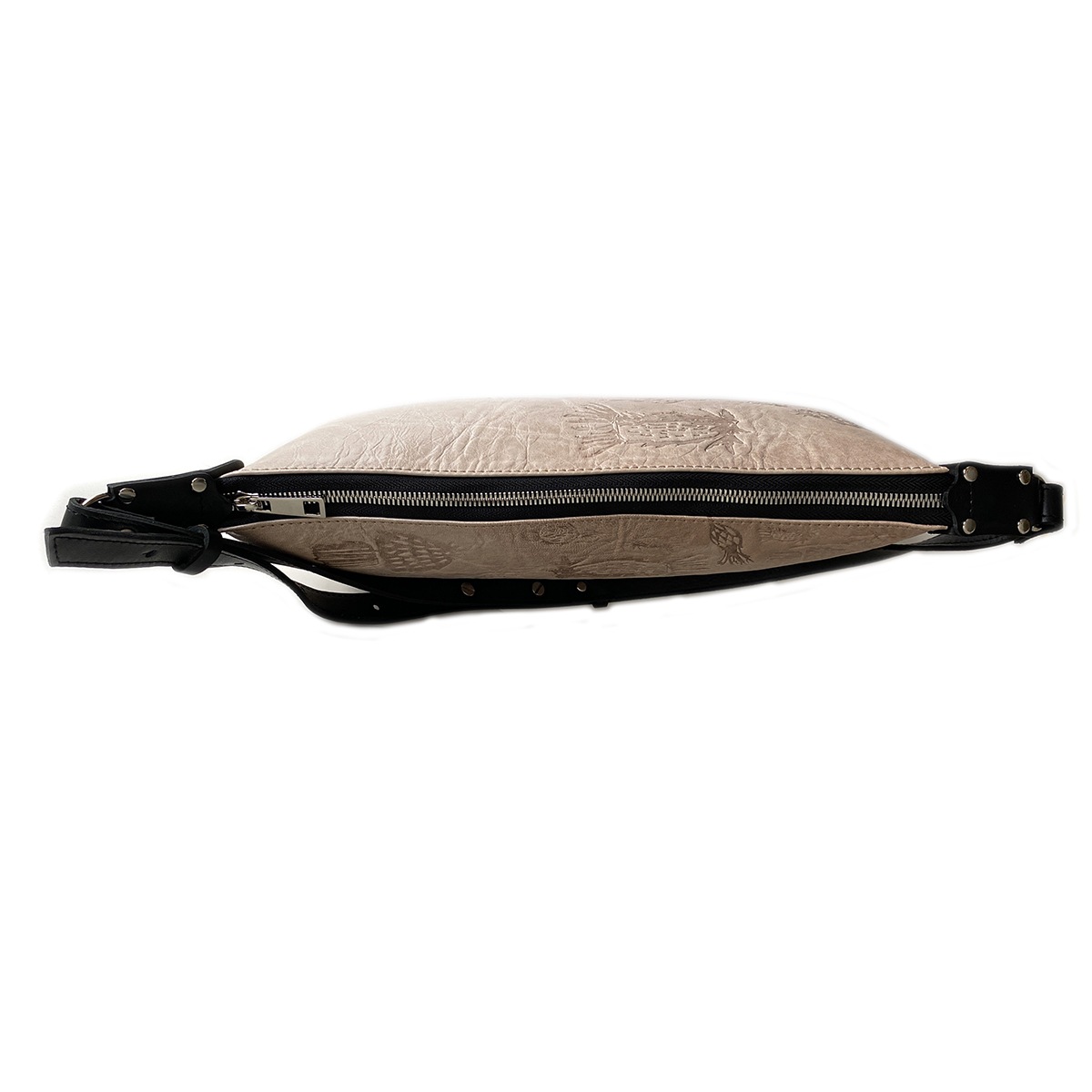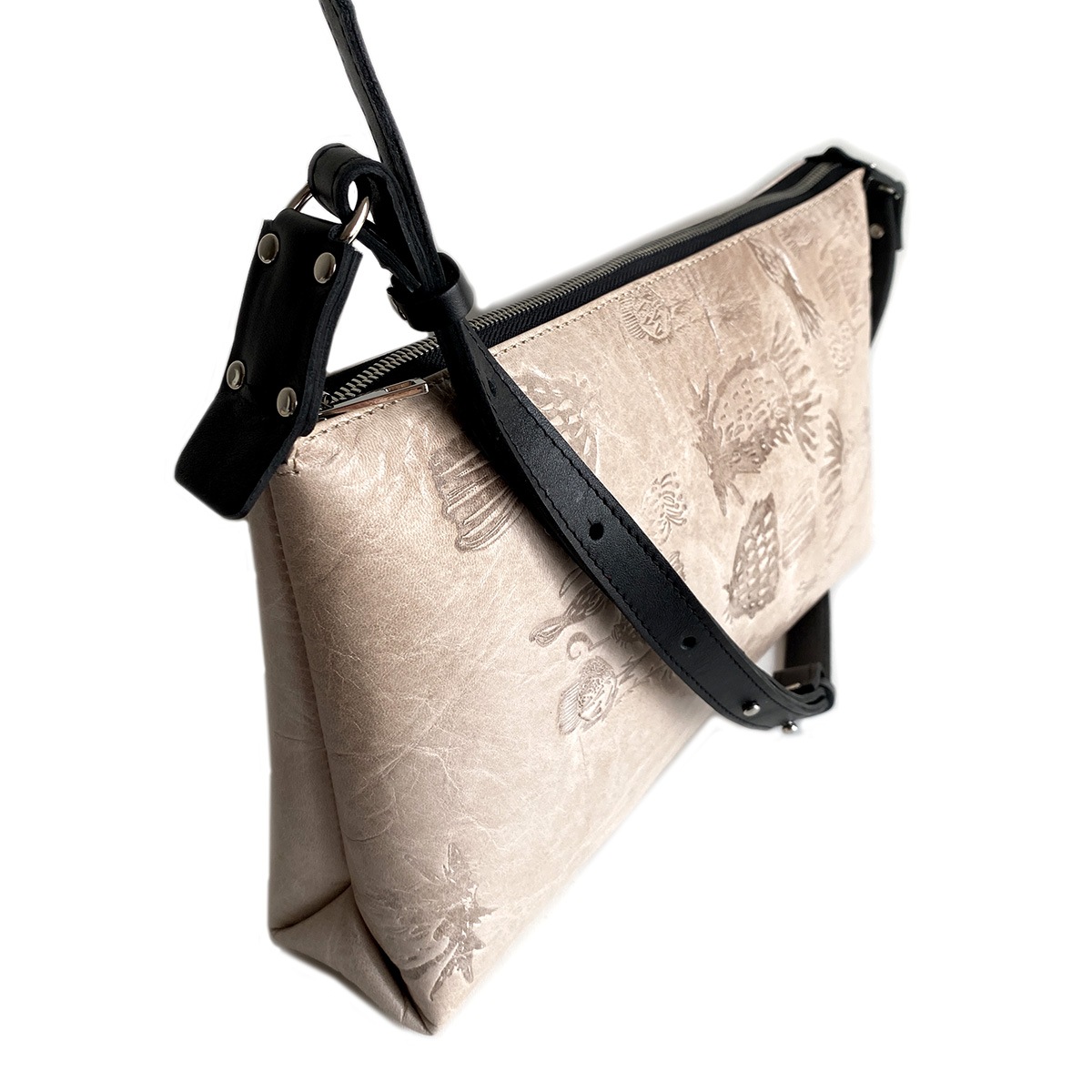Эта дизайнерская сумка ручной работы выполнена из натуральной кожи с необычным винтажным эффектом. Главной особенностью этой сумки является игра контрастов. Нежные цветочные мотивы, тисненые на коже, придают ей женственность и романтичность, в то время как черный ремень с металлической фурнитурой добавляет в образ дерзости и смелости.
