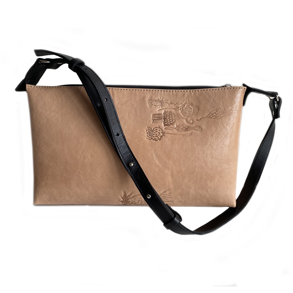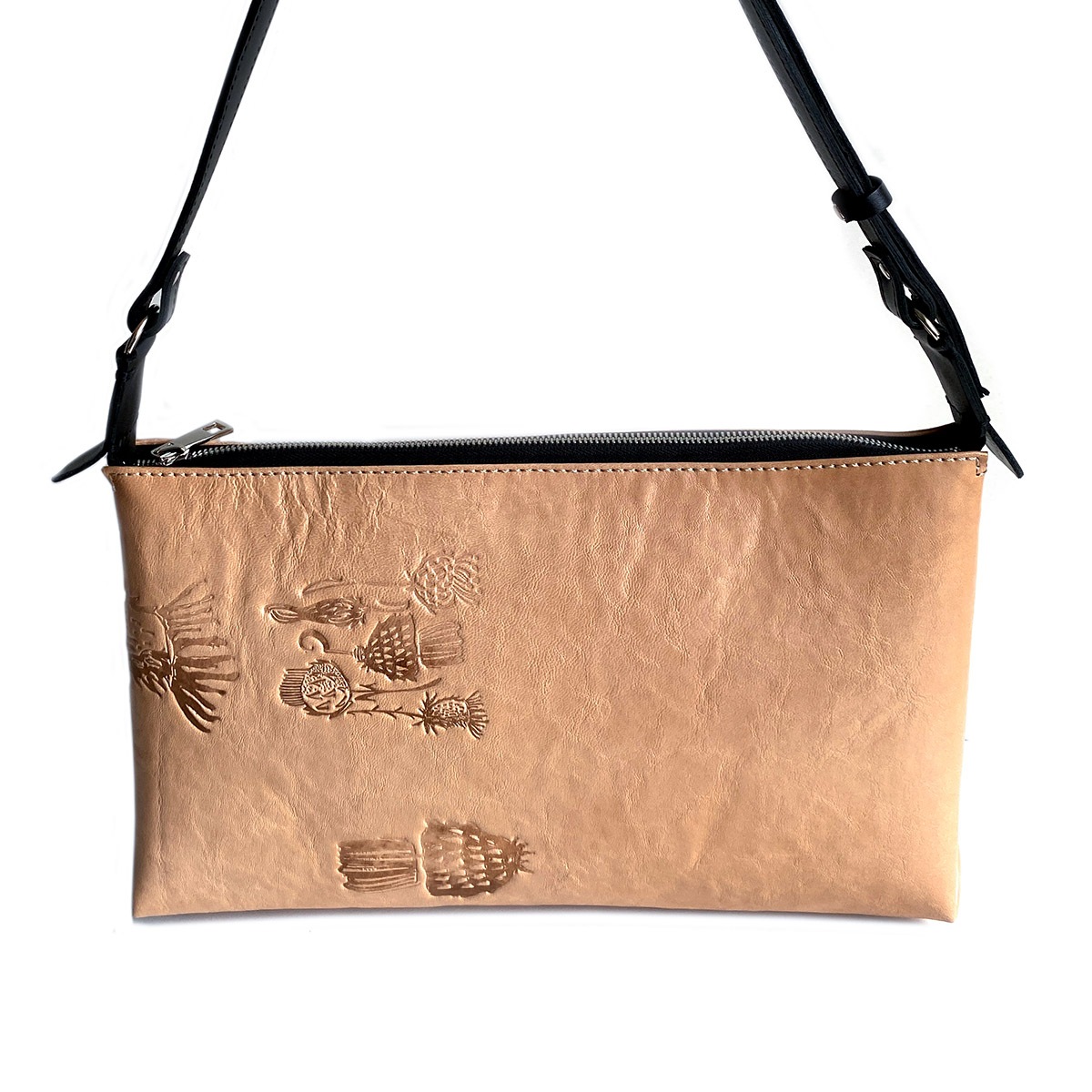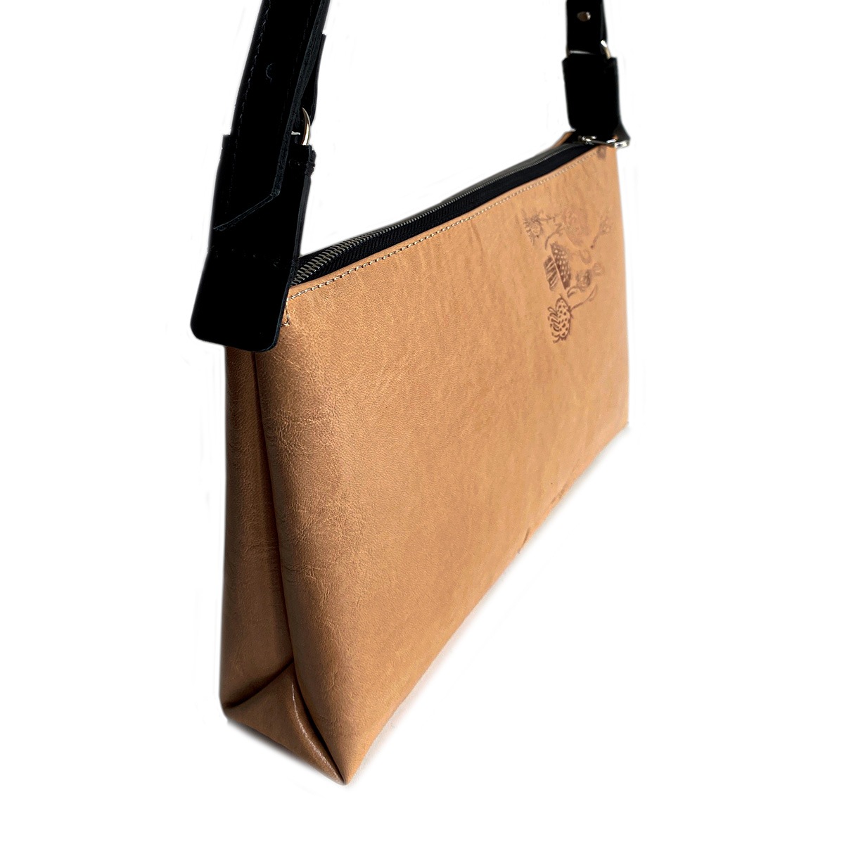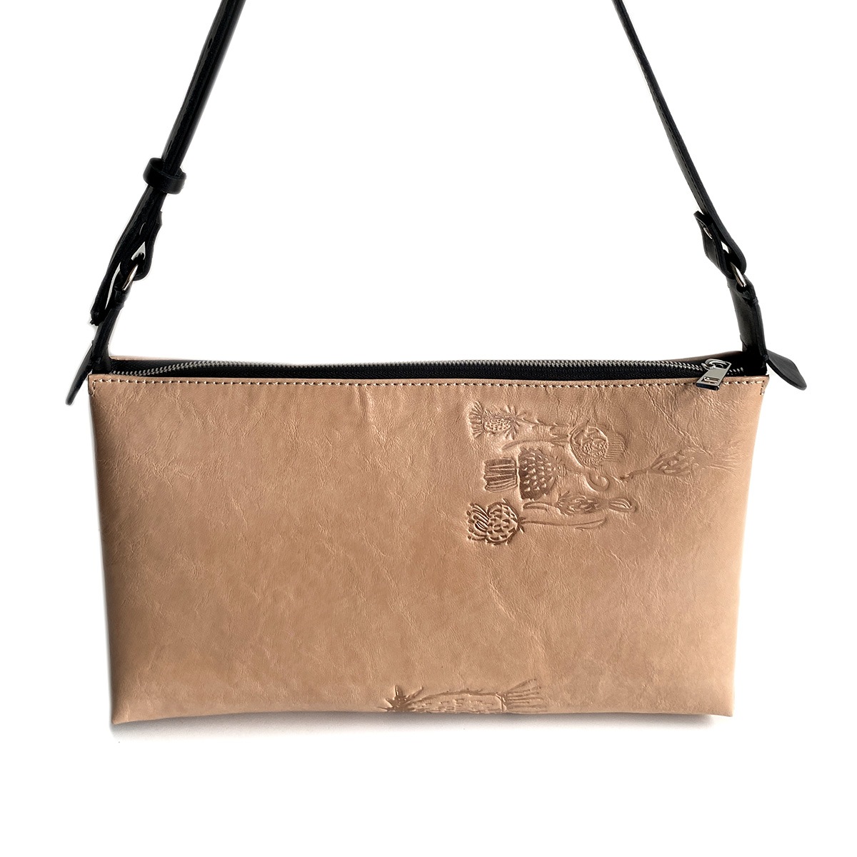Эта дизайнерская сумка ручной работы выполнена из натуральной кожи с необычным винтажным эффектом. Главной особенностью этой сумки является игра контрастов. Нежные цветочные мотивы, тисненые на коже, придают ей женственность и романтичность, в то время как черный ремень с металлической фурнитурой добавляет в образ дерзости и смелости.